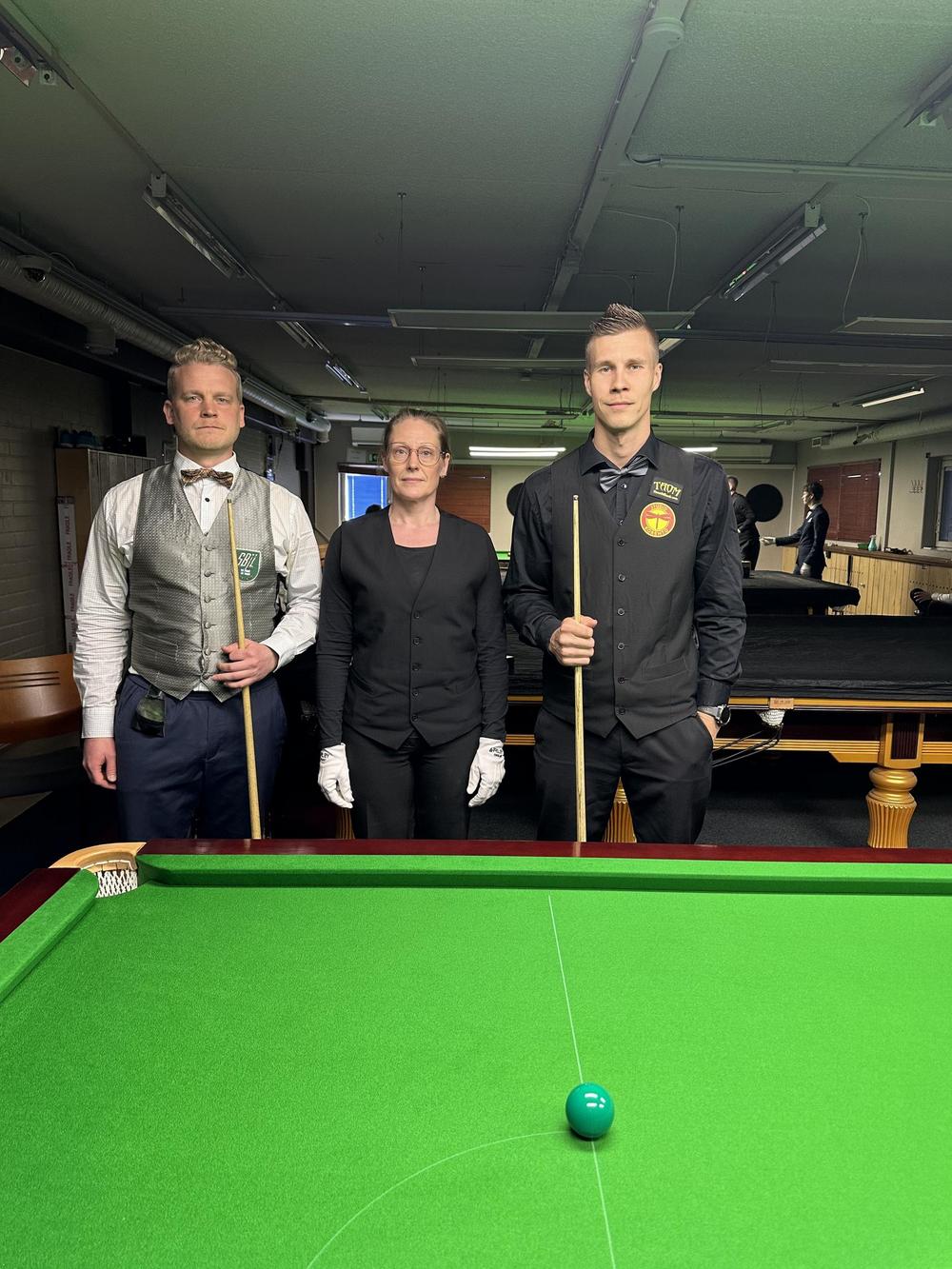 Siv Hartikaisen tuomaroimassa loppuottelussa kohtasivat kaudella 2023–2024 niukalti kilpailleet pelaajat. Hullille kilpailu taisi olla kauden ensimmäinen, eikä Nivakaan ollut osallistunut kuin 6 Redsin SM-kisoihin, joista irtosi voitto, sekä yhteen ranking kilpailuun, jonka loppuottelussa hän taipui Patrik Tiihoselle. Hull ei ole urallaan montaa ottelua hävinnyt SM-kilpailuissa, eikä hävinnyt tälläkään kertaa. Nivalla oli kyllä mahdollisuuksia syrjäyttää mestari valtaistuimeltaan, hän aloitti hyvin ja siirtyi 2–0 johtoon 90 ja 59:n sarjoilla. Kolmannessa Hull nousi omalle tasolleen ja kavensi 107 sarjalla 2–1:een. Neljäs erä oli tiukka ja kenties koko ottelun ratkaiseva. Kun erä kääntyi Hullille ja Niva menetti hyvän mahdollisuuden siirtyä 3–1 johtoon, häneltä taisi usko voittoon loppua. Viidenteen Hull teki 69 ja kun kuudennessakaan Niva ei pystynyt käyttämään tilaisuuksiaan, Robin Hull voitti uransa 15. Suomenmestaruuden erin 4–2. Vaikka Hull voitti jälleen kerran, ainakin Oikarisella ja Nivalla oli mahdollisuutensa, ja viime vuoden kisoissakin Lasse Alvesalo oli paikoilla pudottaa Hull jatkosta. Kenties ensi vuonna joku käyttää tilaisuutensa ja syrjäyttää mestarin. Toki on lisättävä, että onhan tuo helpommin sanottu kuin tehty.