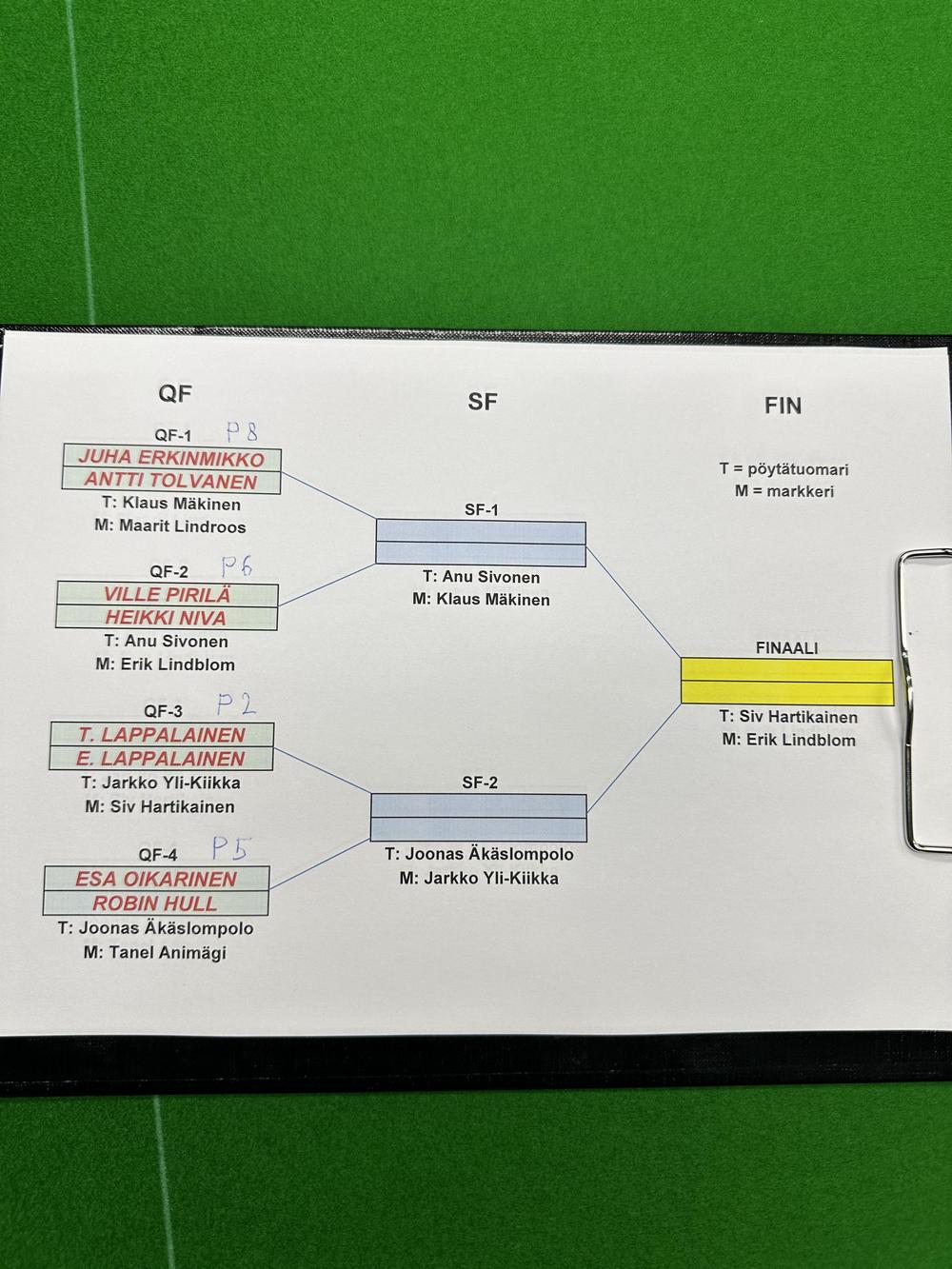Sunnuntaina sitten jatkettiin puolivälierien merkeissä. Otteluparit olivat Juha Erkinmikko-Antti Tolvanen, Ville Pirilä-Heikki Niva, Tuure Lappalainen-Eelis Lappalainen ja Esa Oikarinen-Robin Hull.