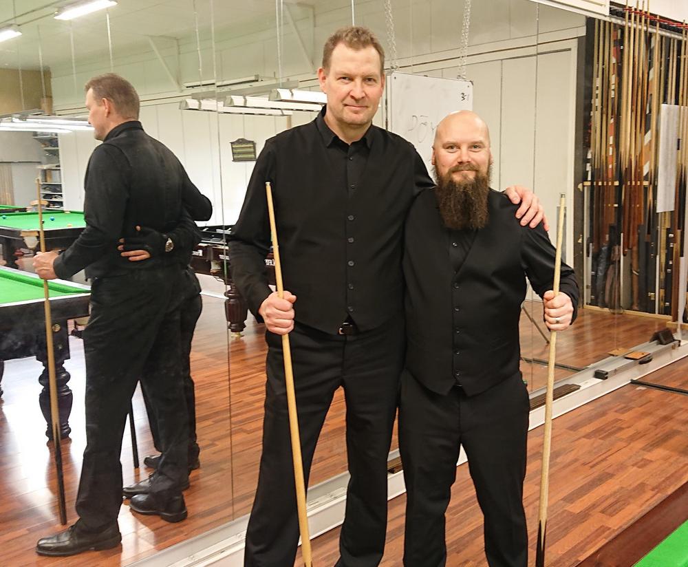 Kylmä pakkasilma otti vastaan snookerin pari SM kilpailijat vastaan Jyväskylässä. Jyväskylän biljardiseuran tiloissa pelattiin kuusi ottelua. JBS:n puolen kilpailunjohtaja Tero Halttunen palasi vajaan kymmenen vuoden tauon jälkeen takaisin pari snooker kilpailuihin Jyviksen Juha Kuuselan kanssa. Pari oli tuolloinkin sama, joten paikallisseurojen kesken oli helppo nähdä yhdistymistä. He saivat vastaansa Toni Huismanin ja Juho Ollilaisen. Ottelu alkoi mielenkiintoisesti noin reilun viiden minuutin turvataistolla, jonka aikana punaiset saatiin oikein hyvin auki. Lopulta pieni epäonnistuminen antoi mahdollisuuden, jolloin Halttunen ja Kuusela pääsivät kokeilemaan. Halttunen pussitteli punaisia ja Kuusela mustia. Sarjan ollessa 33, Kuusela joutui kaikkien maksimeista innostuneiden pettymykseksi pussittamaan pinkin ja Halttusella oli helpohko punainen keskelle sarjan ollessa 39. Punainen kuitenkin hiuksen hienosti ohi keskeltä ja pienet aplodit kuultiin muilta paikalta olleilta. Erä jatkui tämän jälkeen ilman isompia sarjoja, mutta kuitenkin isolla piste-erolla ennen värejä ratkenneena Halttuselle ja Kuuselalle. Seuraavat kaksi erää olivat jo tiukempia, mutta pienellä onnella ja vastustajan harmillisen pienellä marginaalilla ohi lyödyt värit lopussa ratkaisivat kaksi seuraavaa erää myös samalle parille. Neljäs erä oli myös tasaista vääntöä, mutta lopulta Halttusen ja Kuuselan kisakokemus oli liikaa, myös toki onnen hetkensä oli parilla tässäkin, mutta kaikki menevät pitkässä juoksussa lopulta tasan. Ottelu siis Halttuselle ja Kuuselalle 4-0 kolmessa ja puolessa tunnissa.