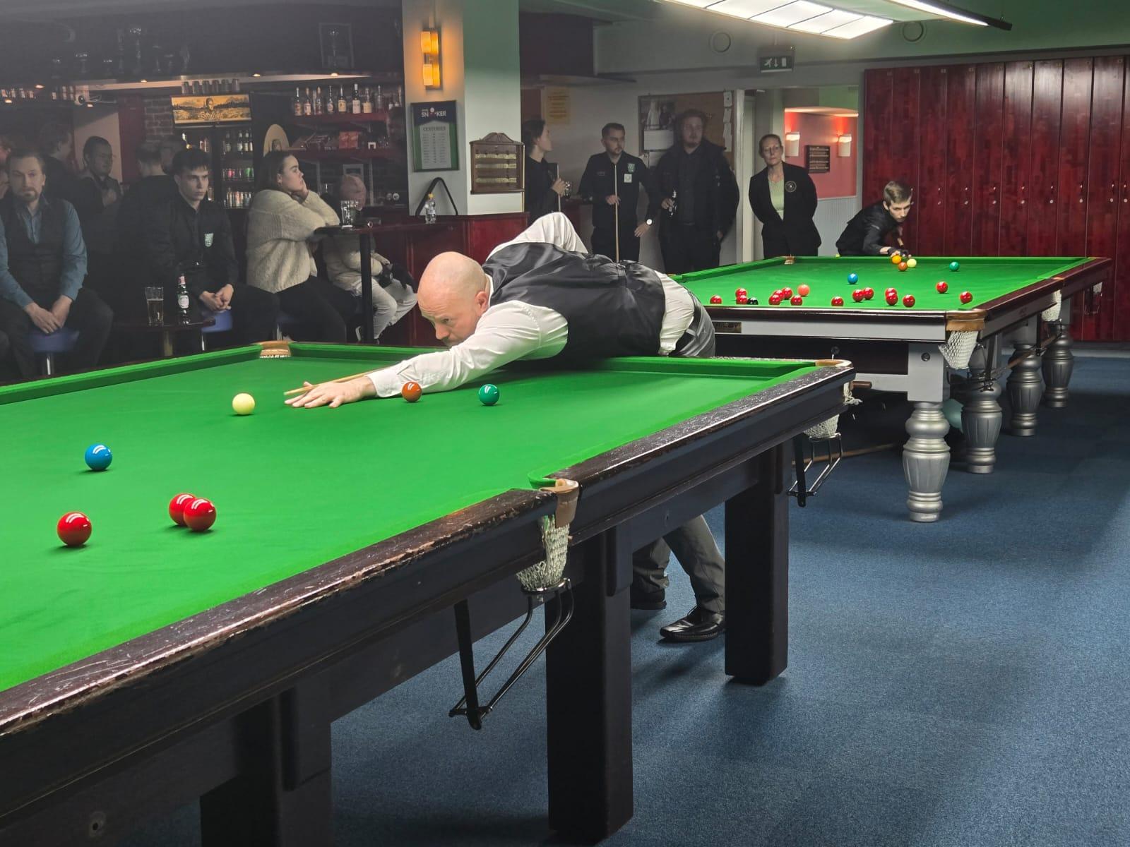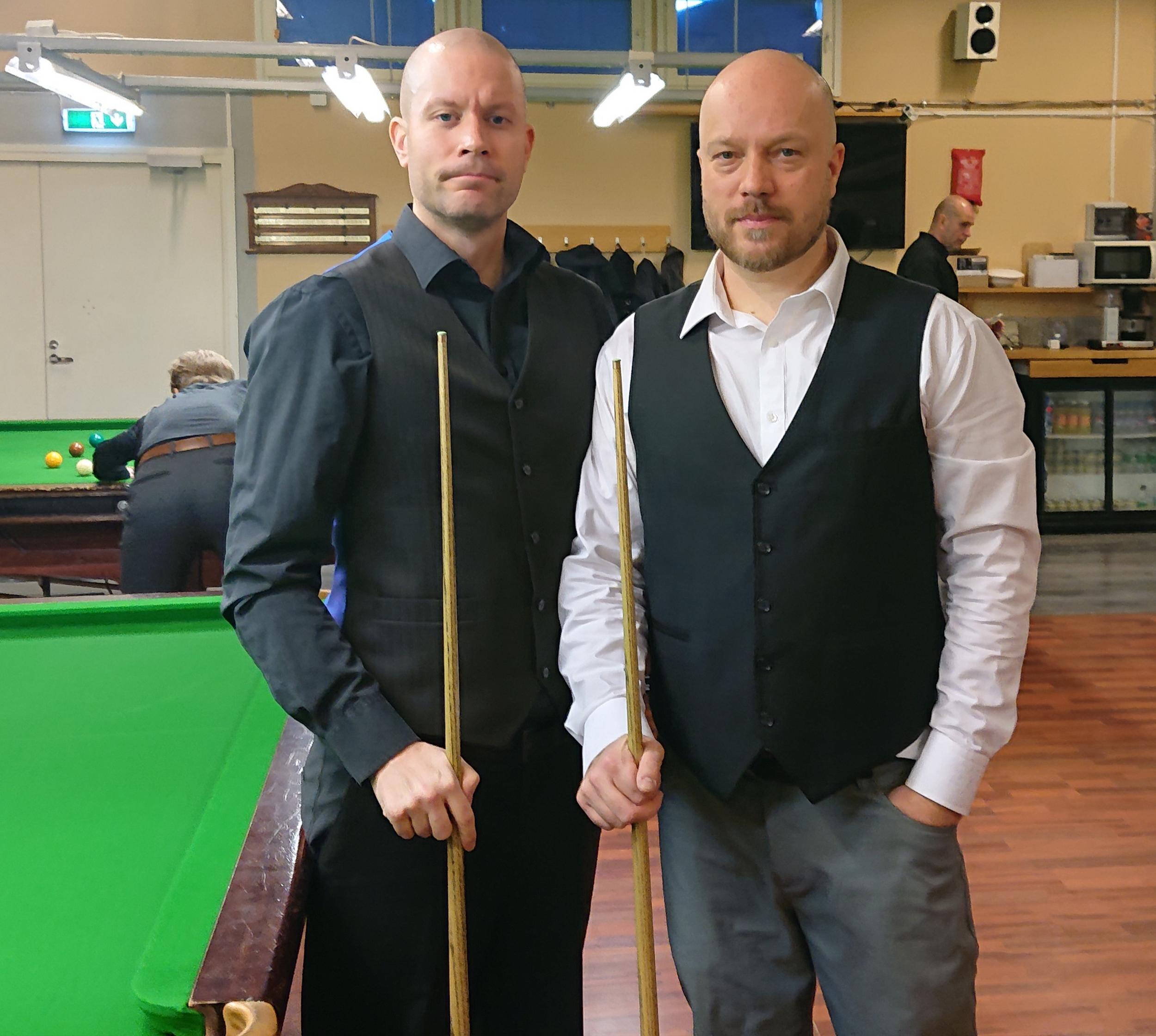 Kylmä pakkasilma otti vastaan snookerin pari SM kilpailijat vastaan Jyväskylässä. Jyväskylän biljardiseuran tiloissa pelattiin kuusi ottelua. JBS:n puolen kilpailunjohtaja Tero Halttunen palasi vajaan kymmenen vuoden tauon jälkeen takaisin pari snooker kilpailuihin Jyviksen Juha Kuuselan kanssa. Pari oli tuolloinkin sama, joten paikallisseurojen kesken oli helppo nähdä yhdistymistä. He saivat vastaansa Toni Huismanin ja Juho Ollilaisen. Ottelu alkoi mielenkiintoisesti noin reilun viiden minuutin turvataistolla, jonka aikana punaiset saatiin oikein hyvin auki. Lopulta pieni epäonnistuminen antoi mahdollisuuden, jolloin Halttunen ja Kuusela pääsivät kokeilemaan. Halttunen pussitteli punaisia ja Kuusela mustia. Sarjan ollessa 33, Kuusela joutui kaikkien maksimeista innostuneiden pettymykseksi pussittamaan pinkin ja Halttusella oli helpohko punainen keskelle sarjan ollessa 39. Punainen kuitenkin hiuksen hienosti ohi keskeltä ja pienet aplodit kuultiin muilta paikalta olleilta. Erä jatkui tämän jälkeen ilman isompia sarjoja, mutta kuitenkin isolla piste-erolla ennen värejä ratkenneena Halttuselle ja Kuuselalle. Seuraavat kaksi erää olivat jo tiukempia, mutta pienellä onnella ja vastustajan harmillisen pienellä marginaalilla ohi lyödyt värit lopussa ratkaisivat kaksi seuraavaa erää myös samalle parille. Neljäs erä oli myös tasaista vääntöä, mutta lopulta Halttusen ja Kuuselan kisakokemus oli liikaa, myös toki onnen hetkensä oli parilla tässäkin, mutta kaikki menevät pitkässä juoksussa lopulta tasan. Ottelu siis Halttuselle ja Kuuselalle 4-0 kolmessa ja puolessa tunnissa.