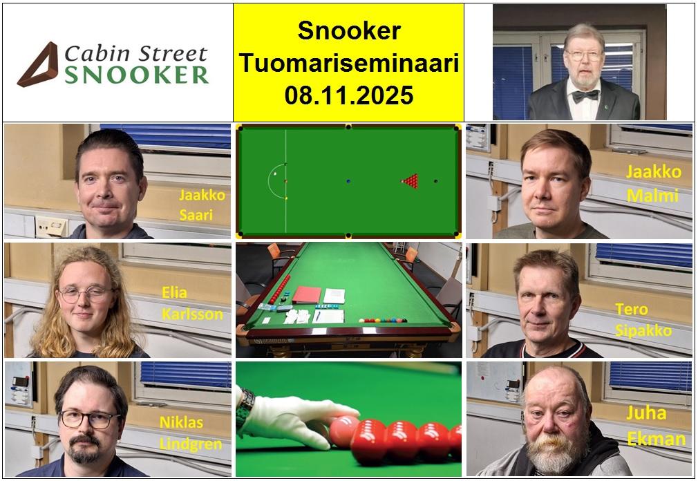 Tuomariseminaari 8.11.2025, Cabin Street Snooker Kuusi tuomaria läpäisi Erik Lindblomin järjestämän tuomaritutkinnon Cabin Street Snookerin salilla. Juha Ekman / Masala Elia Karlsson / Turku Niklas…