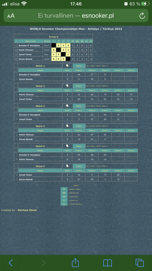 Robin Hull 4-1 Brendan O`Donoghue (Irlanti)