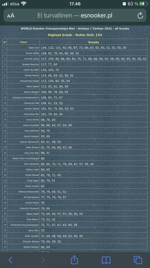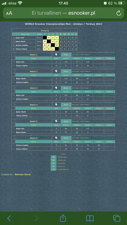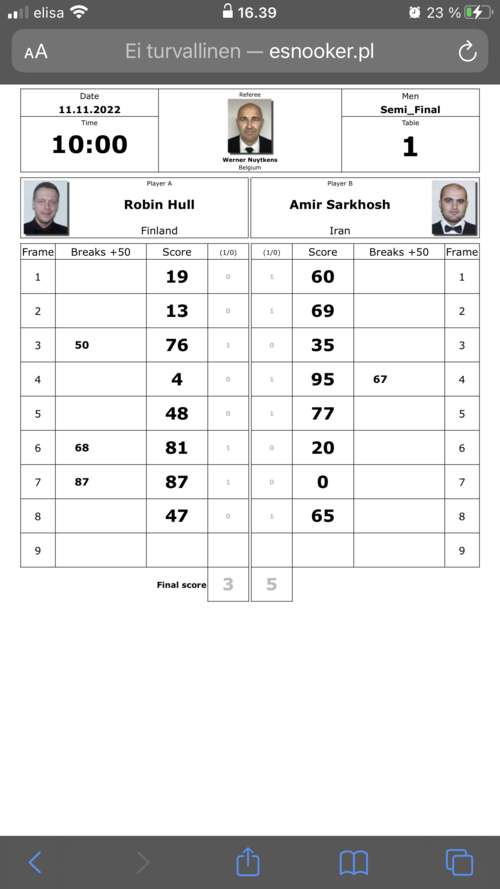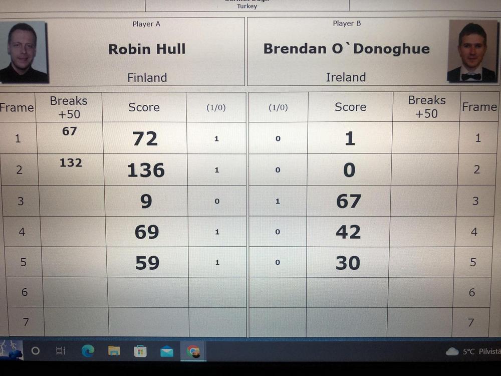 Robin teki kahteen ensimmäiseen erään 67 ja 132 ja irlantilaisen peli oli pois tolaltaan. Robin pelaa semifinaalissa huomenna Iranin Amir Sarkhoshia vastaan.