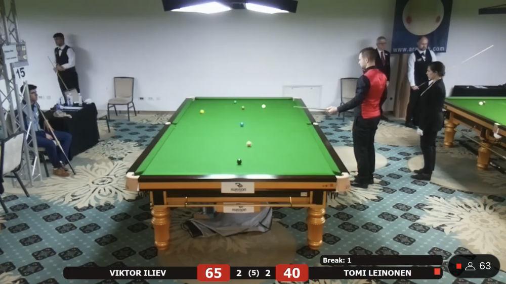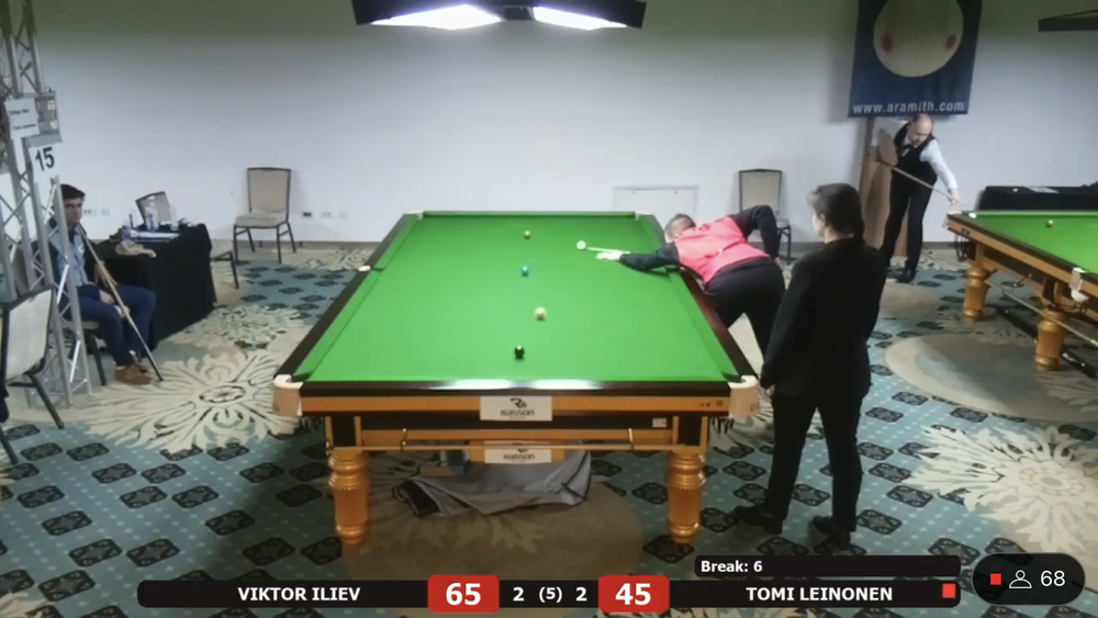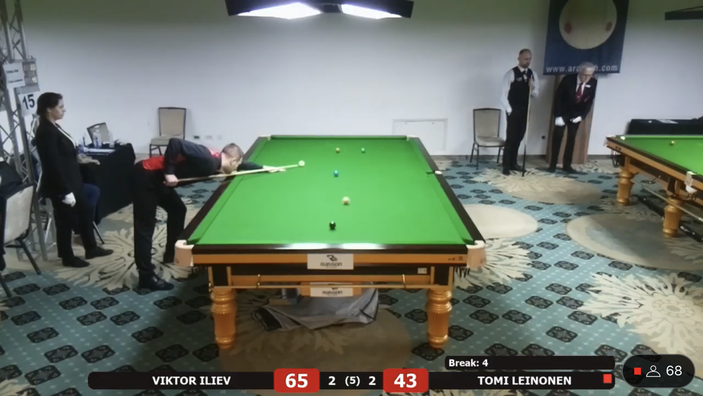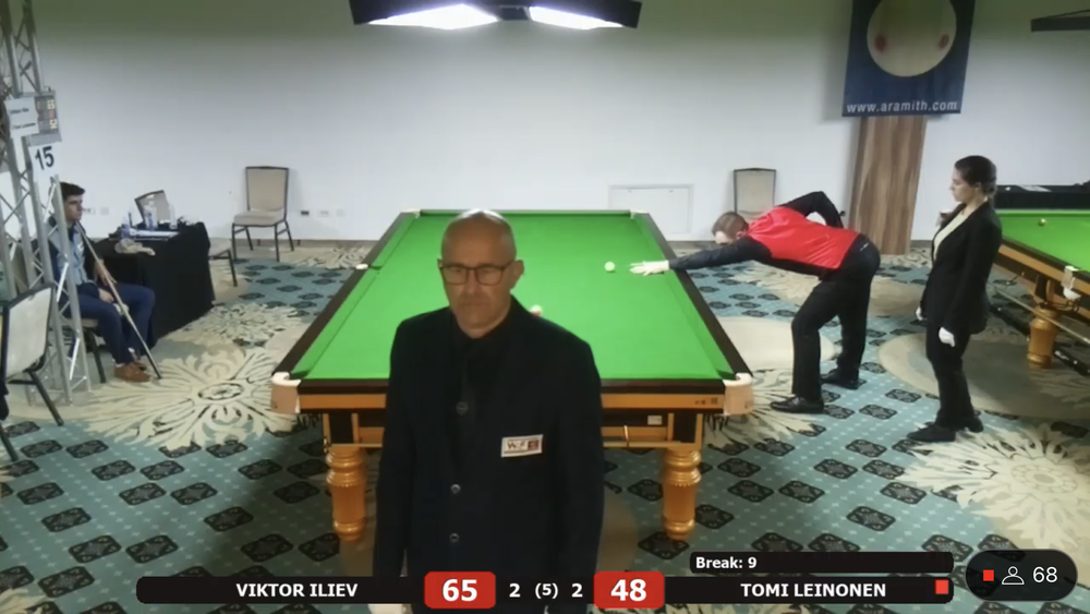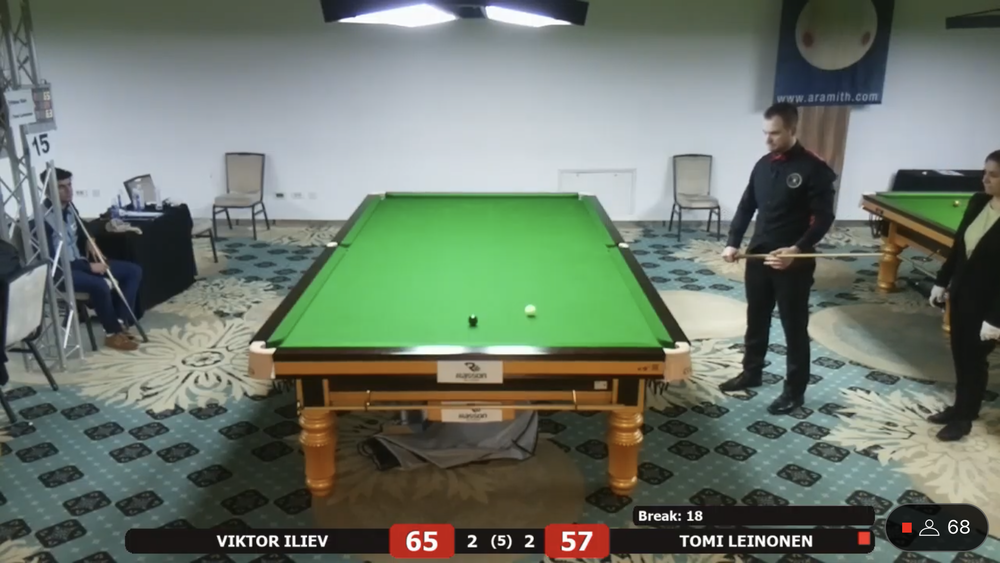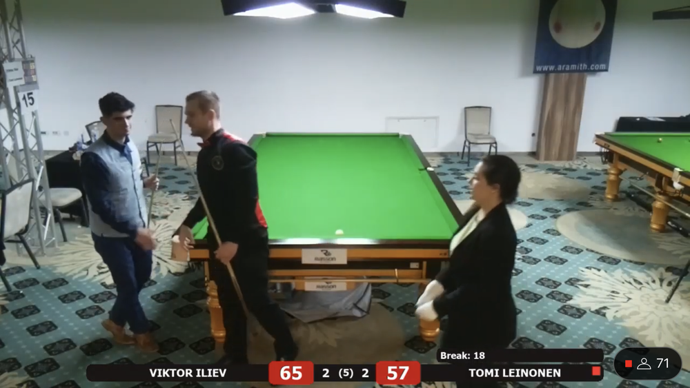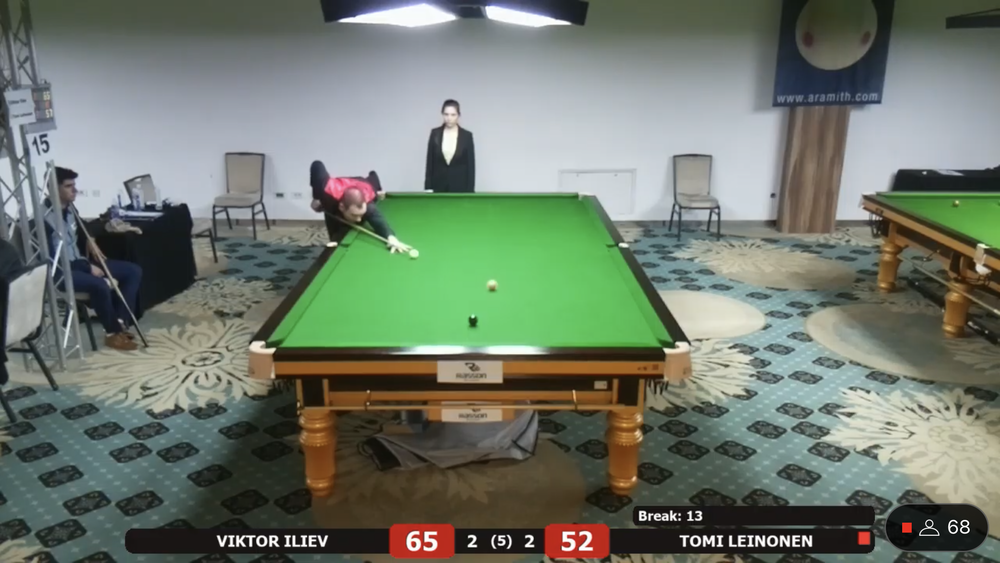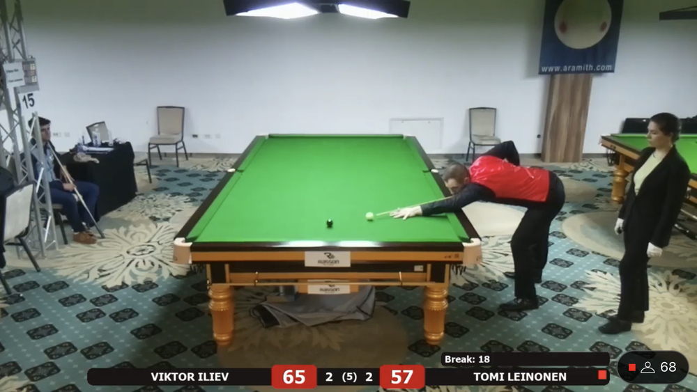 Tomi Leinonen sai vastaansa EM debyytissään Bulgarian kärkipelaajiin kuuluvan ja lohkon ykkössijoitetun Viktor Ilievin. Leinonen siirtyi 2-0 johtoon, mutta bulgarialainen paransi peliään ja vei ottelun kontraan. Leinonen sai tehtyä tiukassa paikassa 31 pisteen putsin ja ryöstettyä ottelun itselleen. Ottelua seurasi striimin välityksellä ratkaisuhetkellä noin 70 katselijaa. Ykköspöytää seurasi samaan aikaan 130+ katselijaa.