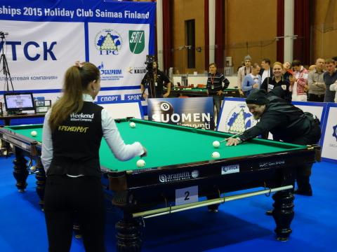 Naisten semifinaali sai lentävän lähdön kun näyttelijä Ville Haapasalo kokeili biljardia naispelaajien kanssa