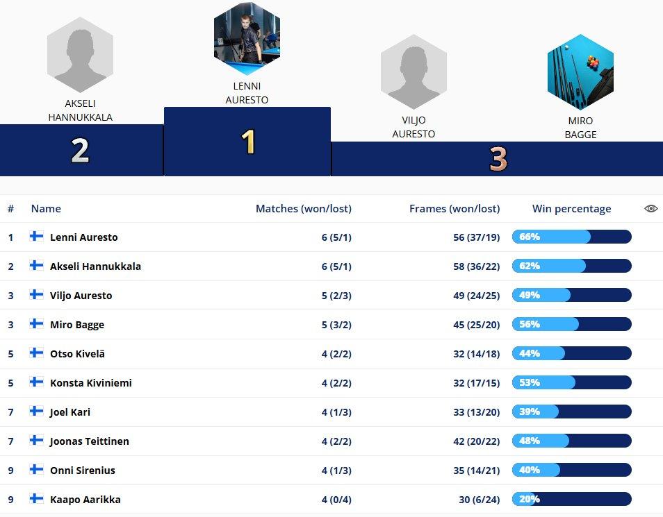 Lahdessa nähtiin MN55 sarjassa hieno kilpailu joka päättyi upean finaalitrillerin päätteeksi TyBi:n Janne Sallisen 6-5 voittoon. Finaalissa Sallinen johti jo 4-1, mutta EBK:n Pasi Kilpivaara kamppaili ottelun vielä ratkaisuerään saakka. Kilpivaaralla oli mahdollisuus tyhjentää kontrassa pöytä mutta helpohko seiskapallon pussitusvirhe käänsi finaalin aivan kalkkiviivoilla takaisin sastamalalaiselle.