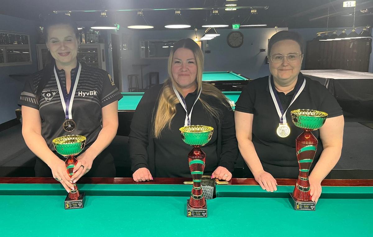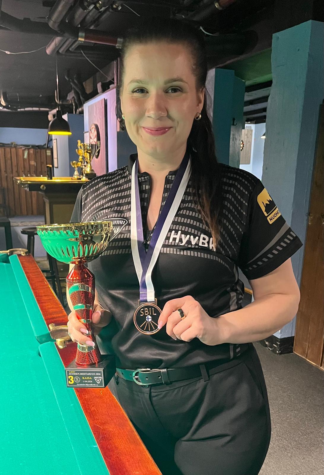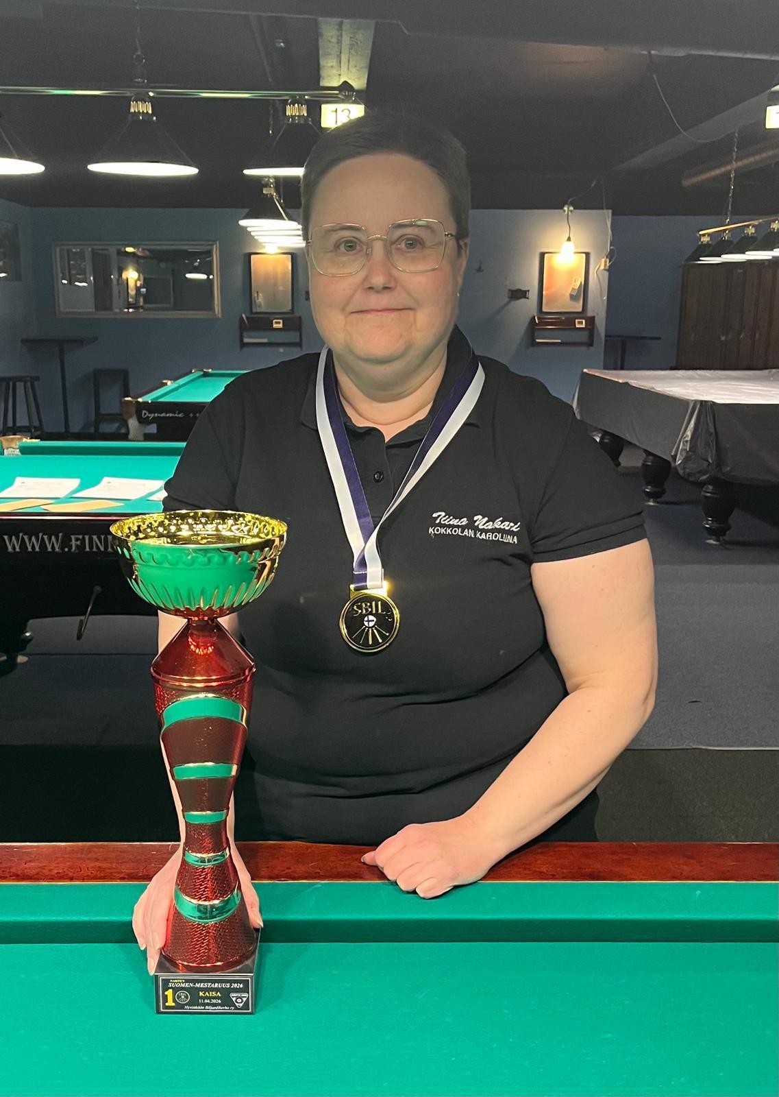 Kokkolan karoliinan Tiina Nakari pelasi naisten kaisan Suomenmestariksi tänä viikonloppuna Hyvinkäällä kolmannen kerran urallaan. Hän voitti finaalissa Joensuun Tarja Savinaisen lukemin 35-19 joka saavutti hienosti SM-hopeaa nyt toisen kerran peräkkäin. SM-pronssille pelasi uran ensimmäisen henkilökohtaisen SM-mitalinsa saavuttanut kotiseura HyvBK:n Pihla Korvenranta.