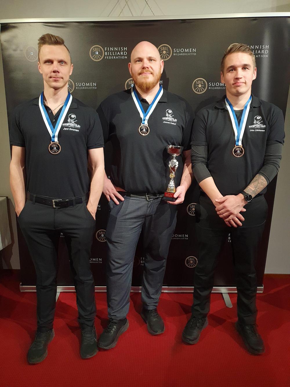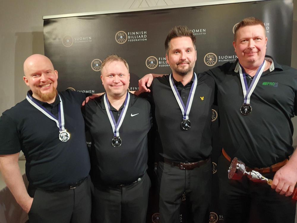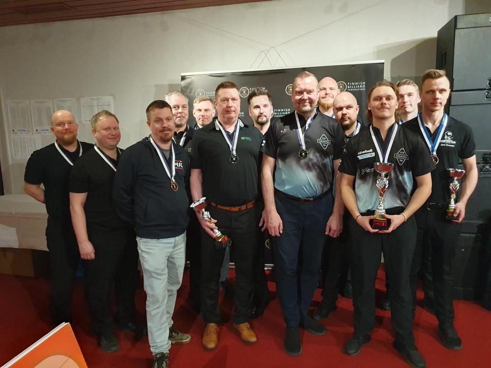 Suomen mestaruuspronssit menivät Kotkan Kivenpyörittäjien 1-joukkueelle sekä Mikkelin Snooker Clubin 2- joukkueelle.