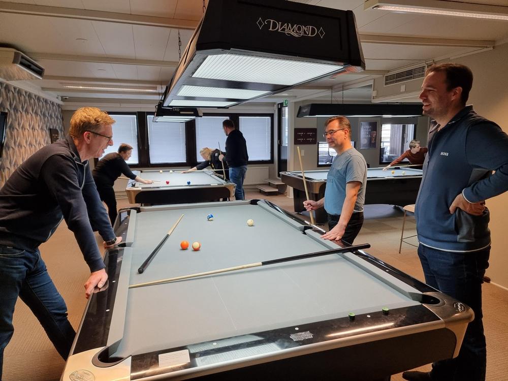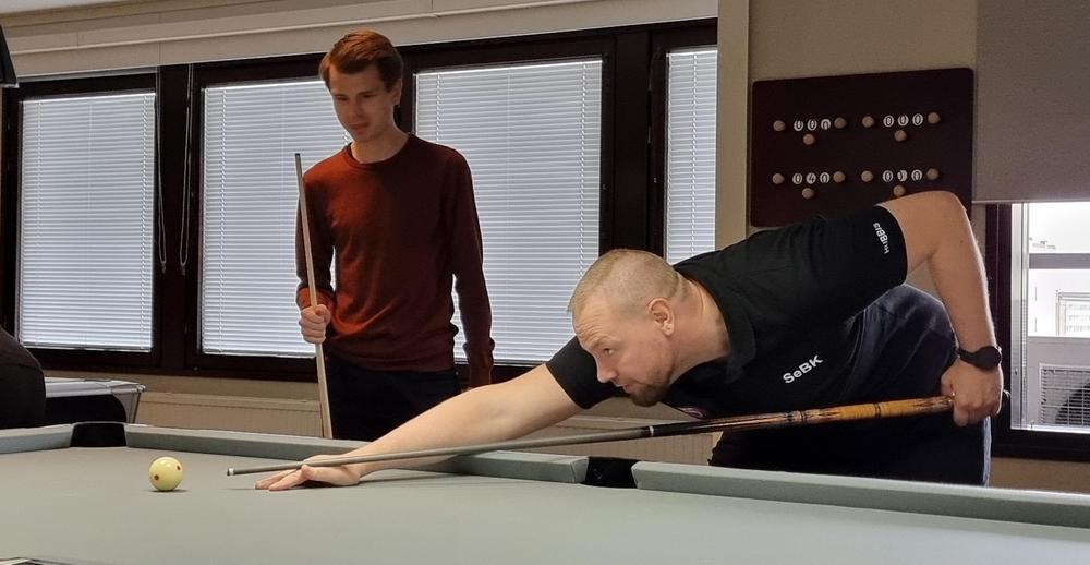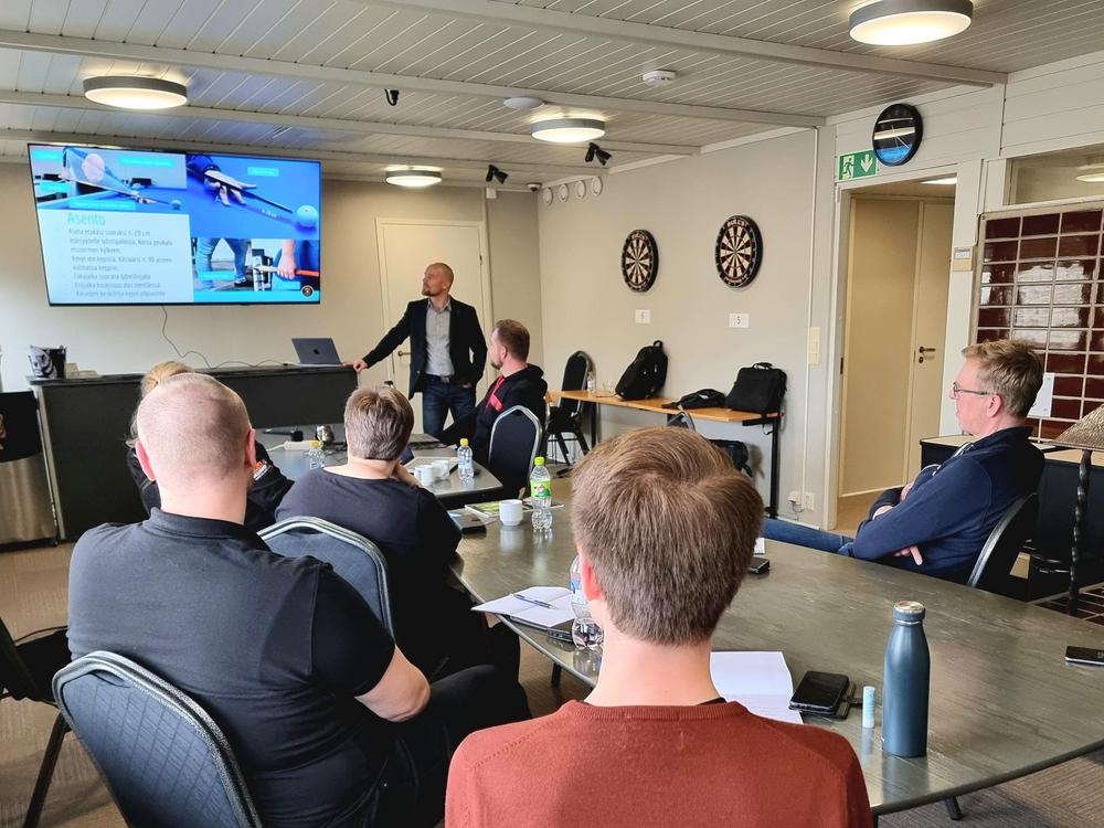 – Valmentajakoulutettavat suoriutuivat tyylillä koko päivän, ja keskustelua syntyi käsiteltyjen aiheiden ympärille runsaasti, mistä olen todella tyytyväinen. Osallistujilla oli järjestään yli kymmenen vuotta biljardikokemusta, joten lajipuoli oli laajasti hallussa. Osalla oli jonkin verran aiempaa valmennuskokemusta, joten pääsimme hyödyntämään jo tähän asti opittuja taitoja ja peilaamaan uusia oppeja niitä vastaan, kuvailee kouluttajana toiminut Eero Hammais.